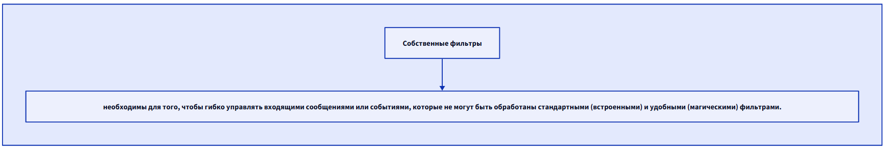 Система фильтров весьма гибкая и мощная, позволяет разрабатывать сложные и многоуровневые логики взаимодействия, делая бота более функциональным. Также, собственные фильтры, позволяют расширить возможности обработчиков, выполняя различные операции до обработчика.
