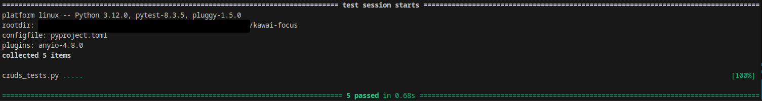 poetry run pytest kawai_fokus/tests/cruds_tests.pyРезультат тестирования: