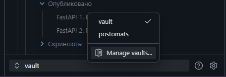 Для того, чтобы создать новое хранилище, в нижнем-левом углу нажимаем по открытому и нажимаем "Manage vaults...".
