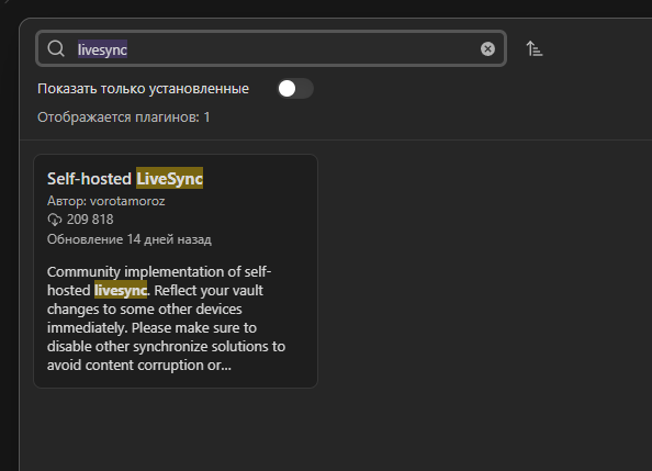 В поле поиска вводим livesync и отобразится нужный нам плагин. Выбираем его.